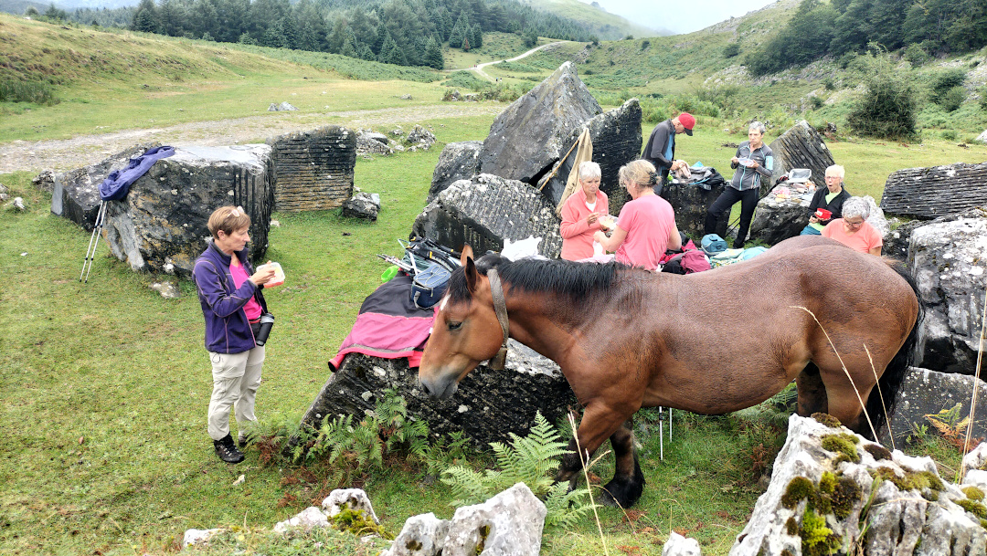 Après Mendibeltz, qui, malgré son nom était plutôt… « gris-brouillard », le ciel s’est dégagé et nous avons partagé la montagne avec de nombreux ovins, puis notre casse-croûte dans une borde au joli toit de lauzes. Merci à Jeannot d’avoir éclairé notre chemin.